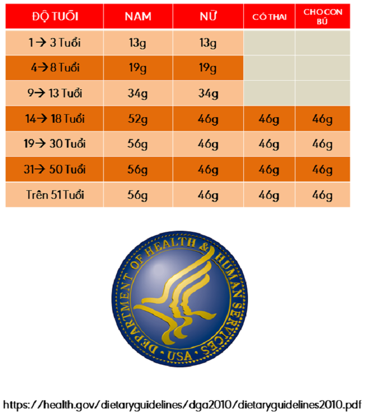 6. Lượng Protein(Đạm) Khuyến Nghị Bổ Sung Hằng Ngày Cho Cơ Thể (Theo dữ liệu từ Bộ Y Tế và Dịch Vụ Nhân Sinh Hoa Kỳ - U.S. Department of Health & Human Services):